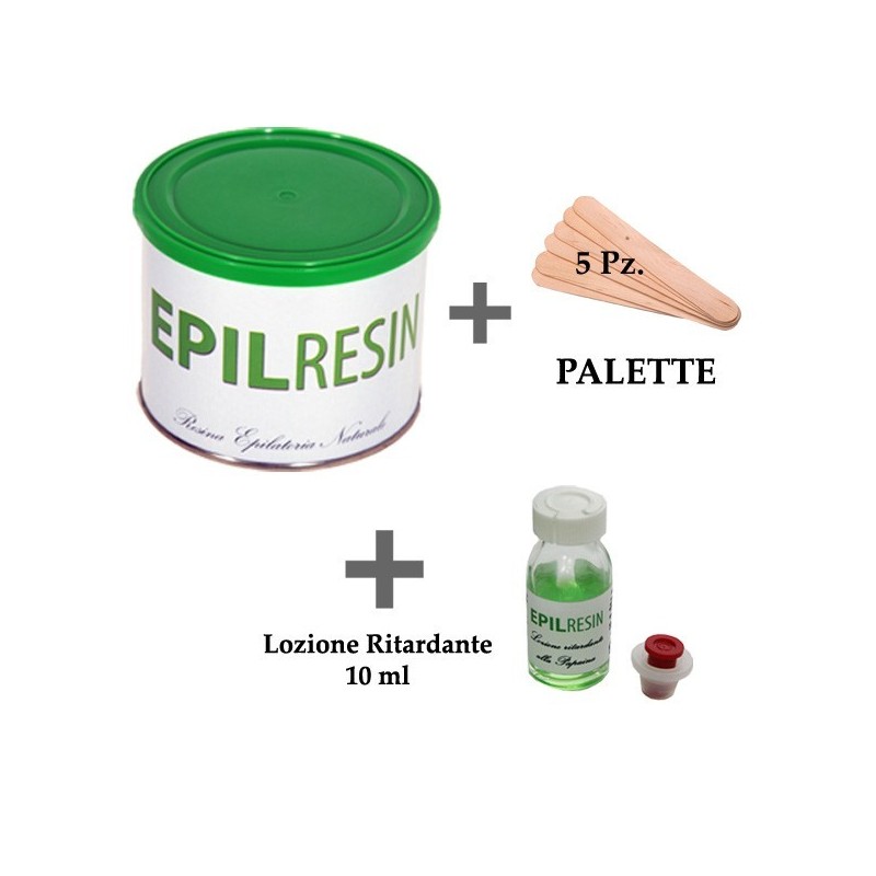 1 barattolo di Epilresin per fornello scaldacare da 500 ml + 1 Lozione ritardante Epilresin alla papaina da 10 ml. + 5 palette spalma cera in legno