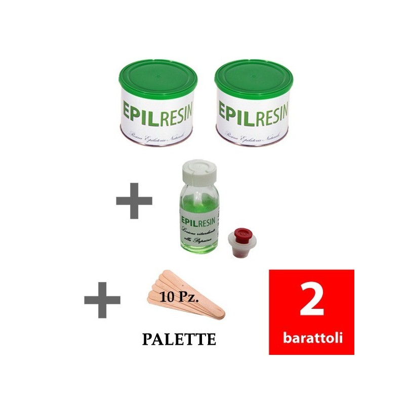2 barattoli di Epilresin per fornello scaldacare da 500 ml + 1 lozione ritardante Epilresin alla papaina da 10 ml. + 10 palette spalmacera in legno