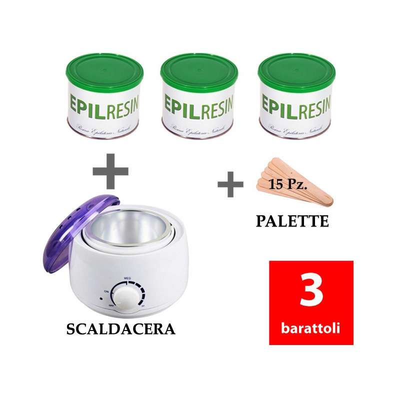 3 barattoli di Epilresin per fornello scaldacare da 500 ml + 1 fornello scaldacera Liberty + 15 palette spalmacera in legno