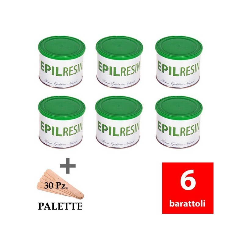 6 barattoli di Epilresin per fornello scaldacare da 500 ml + 30 palette spalmacera in legno
